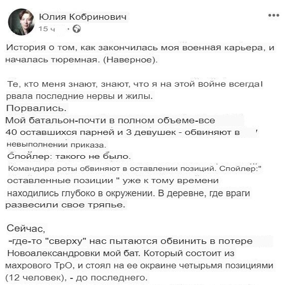 Нытье фольксштурма о том, как они сдали Новоалександровку (к северо-западу от Очеретино) и сбежали из окружения, а теперь на них пытаются повесть сдачу населенного пункта. Судя по заявлению данного участника фольксштурма, в поселке уже вывешены российские флаги.