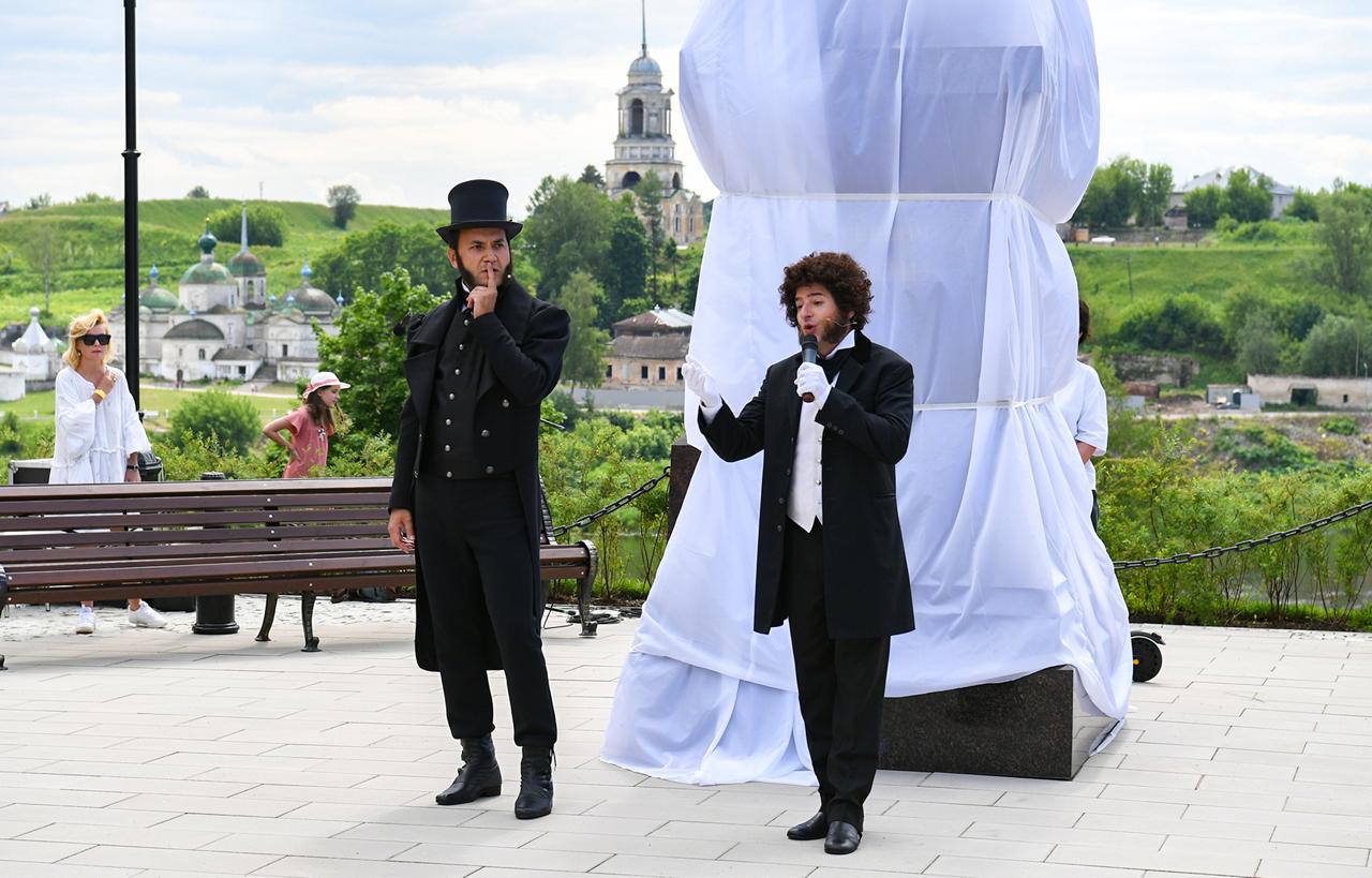 Открытие памятника прошло без традиционной церемонии: вместо этого была театральная постановка, в которой актер Иван Стебунов, представляющий Пушкина, открыл памятник.