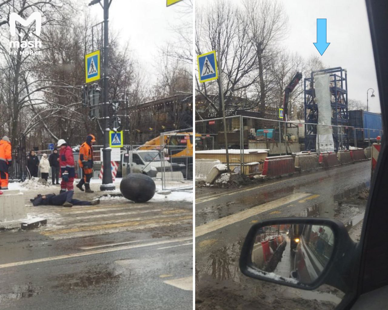 Редкая питерская аномалия — огромный резиновый шар вылетел из трубы на дороге и сшиб прохожего с ног. Бедолага просто шёл по своим делам возле Петропавловки.