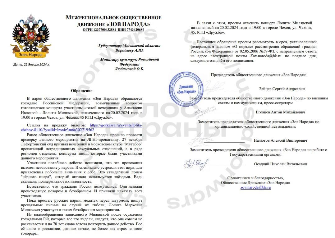 Активисты из «Зова народа» обратились к губернатору Московской области Андрею Воробьеву и министру культуры Ольге Любимовой с просьбой снова обратить внимание на концертную деятельность участников «голой вечеринки» Ивлеевой. И речь опять идет о Лолите Милявской, чьи выступления сейчас отменяют по всей стране. На сей раз неравнодушные просят отменить предстоящий февральский концерт опальной звезды в Чехове.