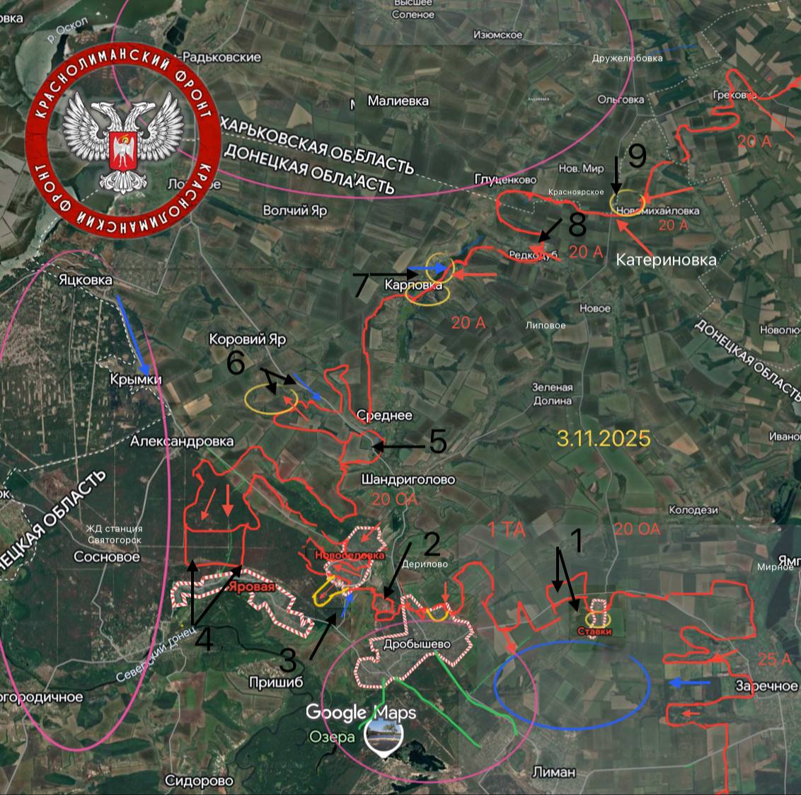 8. В н.п. Редкодуб без изменений половина н.п. за Гвардейцами, половина в серой зоне. Зону боев, а также стрелка атак противника в Редкодуб убрана в публикации от 31.10.2025