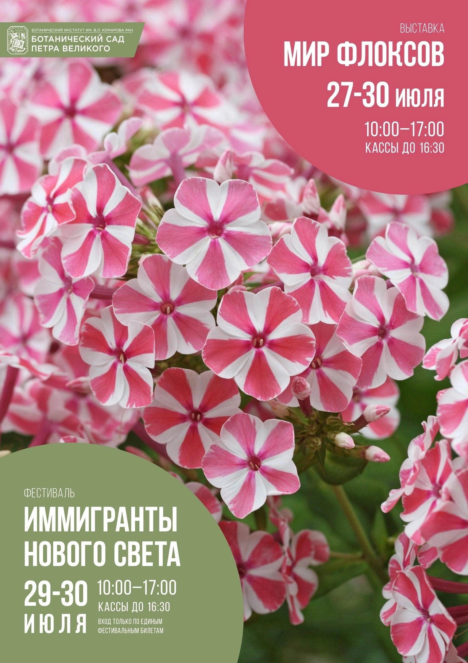Выставка «Мир флоксов» пройдёт 27–30 июля 2023. 27–28 числа попасть на неё можно по любым билетам в Сад, 29–30 июля вход по общему фестивальному билету. В выходные билеты на фестиваль будут продаваться с 10 до 16.30, а с 17 до 19 будут доступны только парковые билеты. 0+