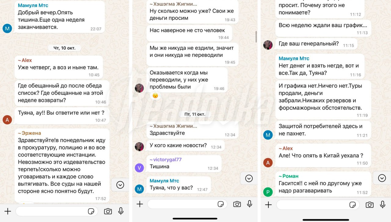 Один из обманутых Дмитрий (имя изменено) рассказал Readovka, как он с женой купил путевку за ₽150 тыс, но через 3 дня у них заболел родственник и поездку пришлось отменить. Семья приехала в офис, чтобы оформить возврат, но конторы на месте уже не было. Добиться возврата средств не удалось, зато в переписке с Дмитрием Туяна поведала, что гендир турфирмы — ее бурятский племянник, однако всеми делами занимается она. После этого мошенница пропала с радаров, где она сейчас неизвестно — женщина не берет трубку и не отвечает на сообщения.