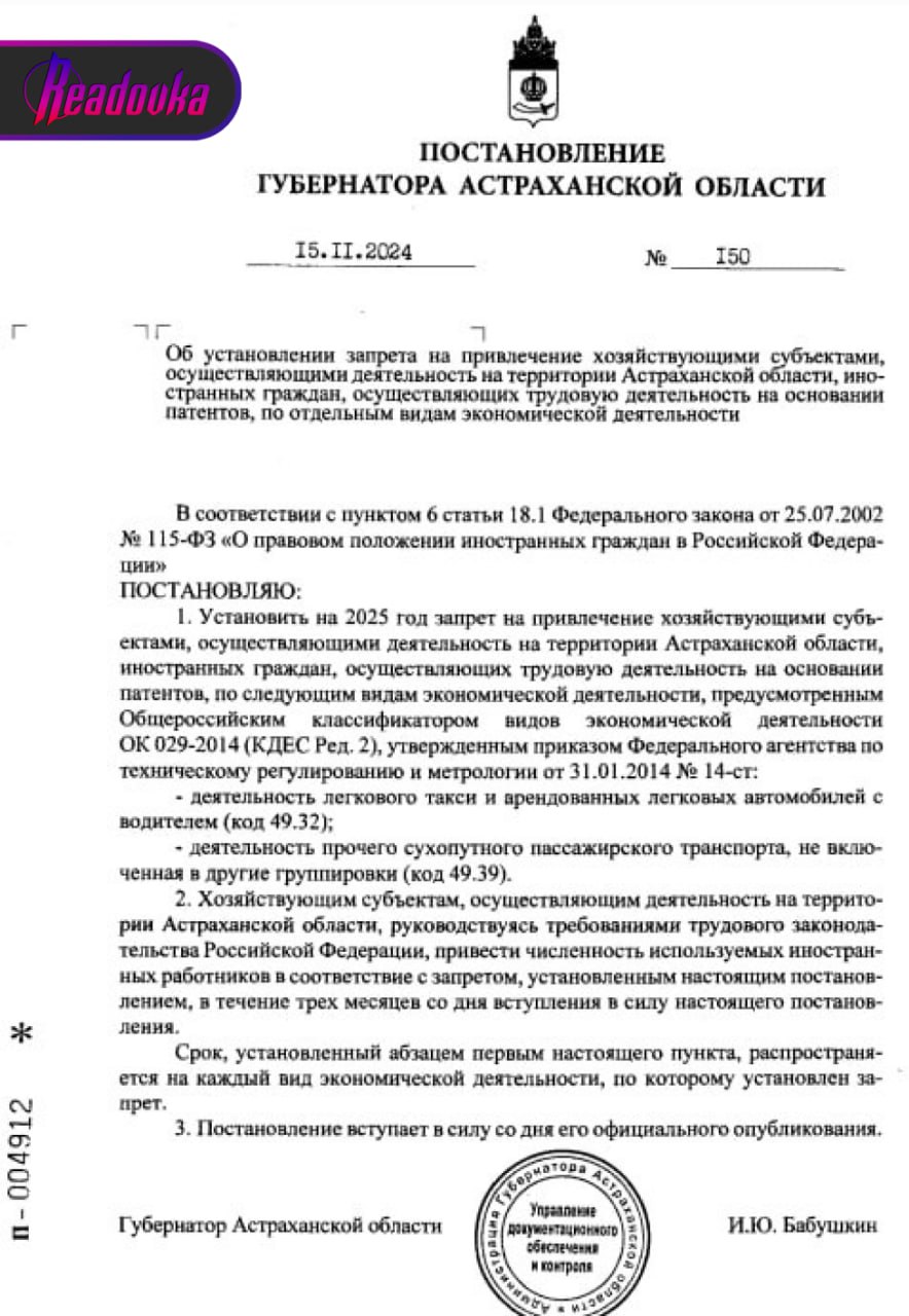 Губернатор Астраханской области подписал постановление, ужесточающее запрет на трудоустройство мигрантов. С 2025 года иностранцам запрещено будет работать таксистами, а также водителями автобусов и маршруток. До 1 января у работодателей есть время уволить всех иностранных сотрудников. Подобные меры действуют уже в 41-м регионе России, причем во многих из них мигрантам уже запретили работать в пассажироперевозках, а запрет в сфере такси даже готовятся вывести на федеральный уровень.