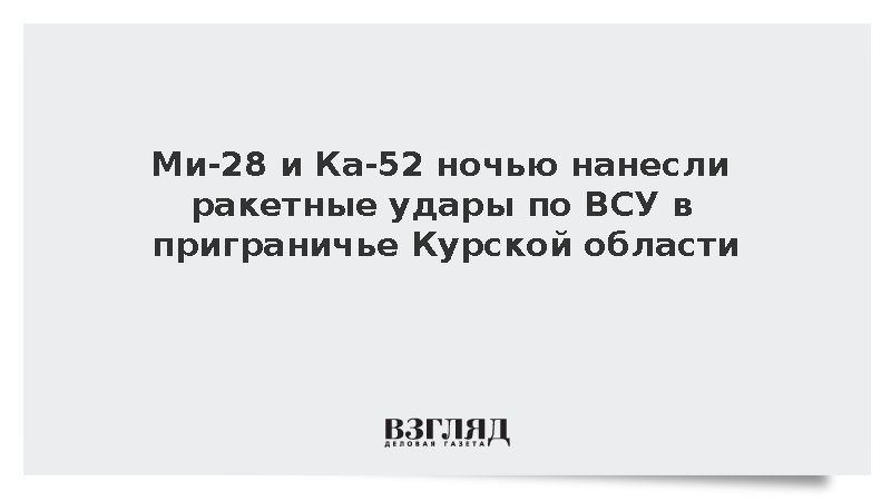 Российские вертолеты Ми-28 и Ка-52 ночью нанесли удары ракетами по скоплению живой силы и техники ВСУ в приграничном районе Курской области, сообщили в Минобороны России.