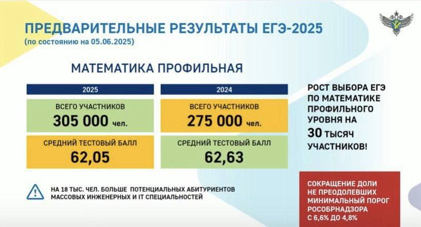 Глава Рособрнадзора Анзор Мусаев назвал математику прорывом года на пресс-конференции по итогам ЕГЭ. В 2025-м число тех, кто решил сдавать профильную математику на экзамене, впервые превысило 300 тысяч. 60% выпускников набрали более 60 баллов, что говорит об их готовности продолжить образование по техническим и IT-специальностям.