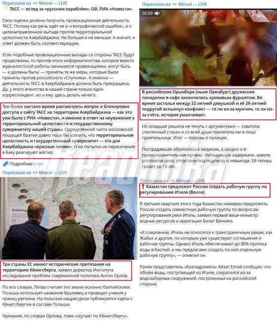 Кроме того, Minval в своих публикациях начал менять современные названия русских городов на старые. Оренбург назвали Орынбор (такое не использовалось официально никогда, хотя название Чкалов было в ходу), а Калининград и стало Кенигсбергом. Досталось и реке Волге — теперь в публикациях азербайджанских СМИ она Итиль.