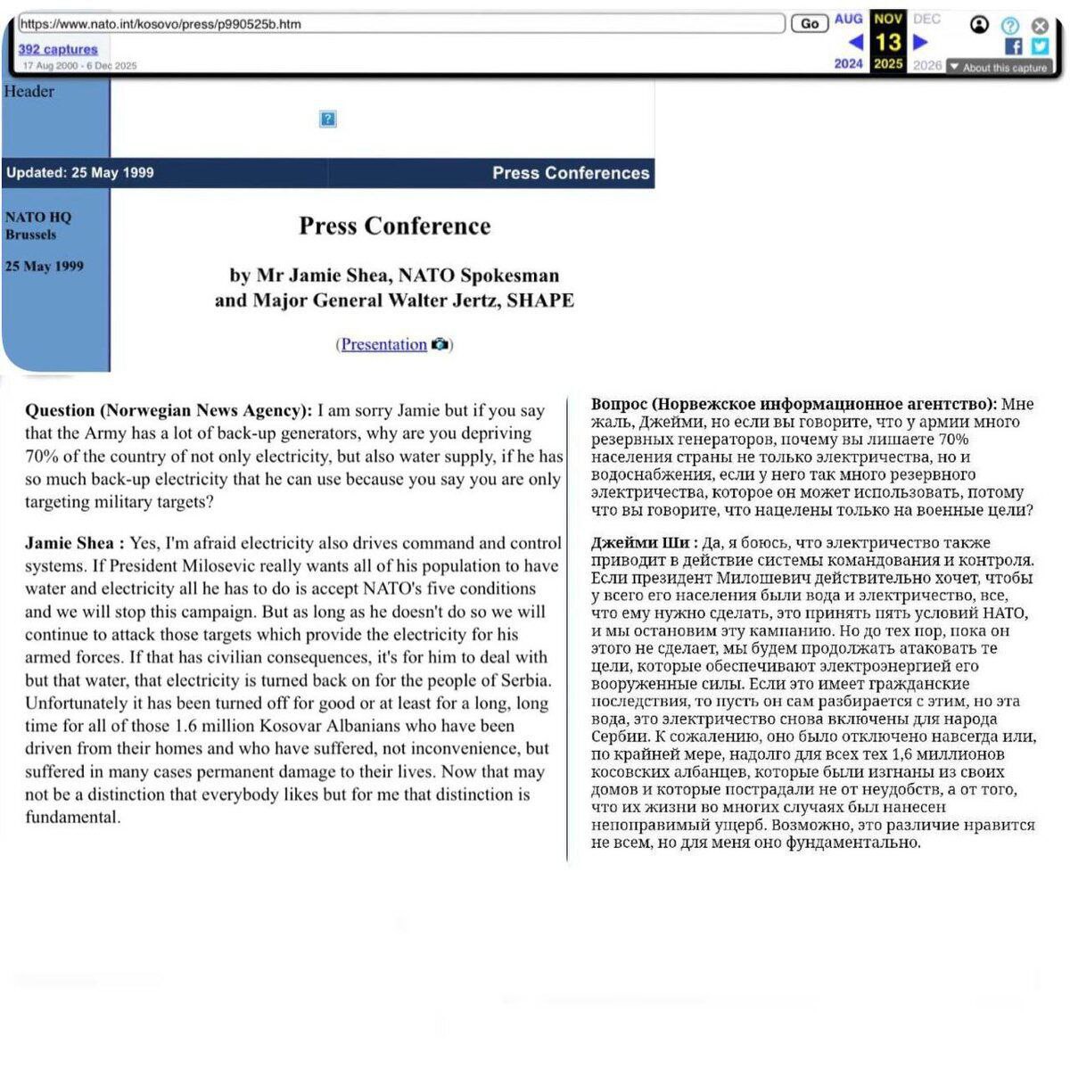 🚫 НАТО удалило со своего веб-сайта стенограмму брифинга от 25 мая 1999 года, в которой представитель альянса Джейми Ши оправдывал удары по гражданской инфраструктуре Сербии