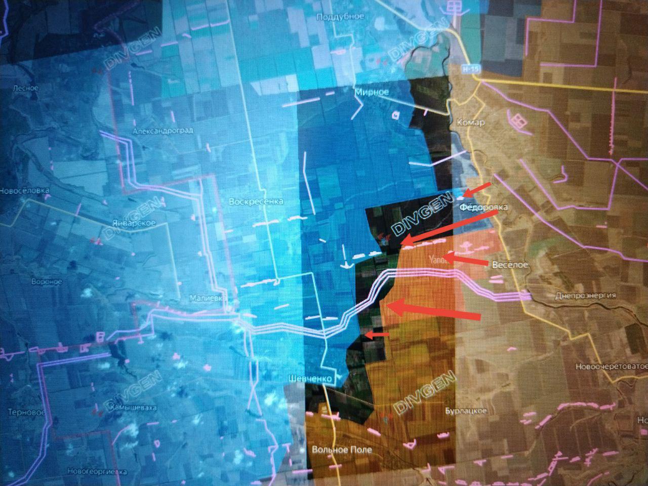 Подразделения ГрВ "Восток" продолжают взламывать оборону противника в 4,5-6 км от Днепропетровской обл. в районе с. Шевченко.