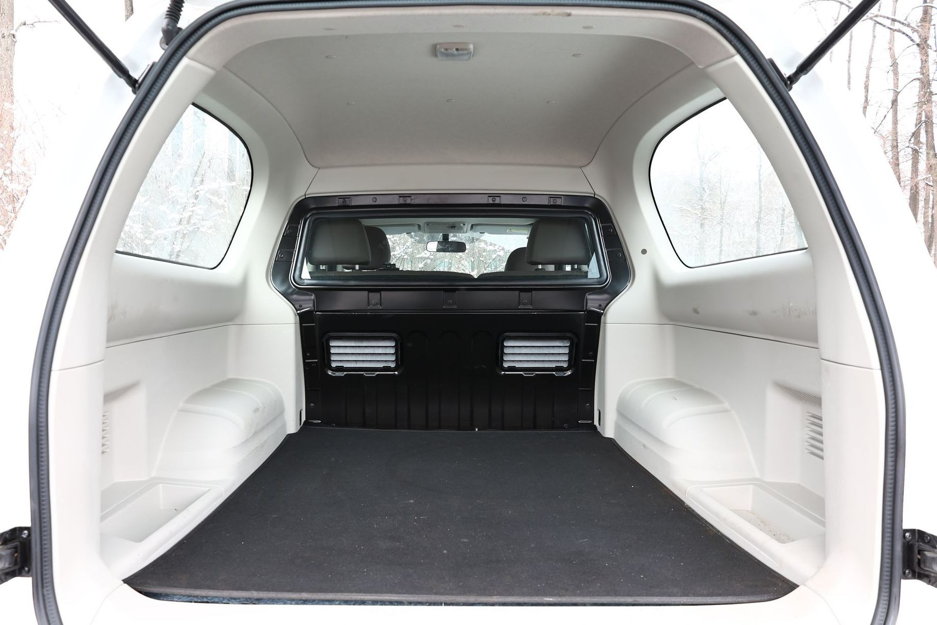 Всего здесь чуть больше двух кубометров объёма: габариты багажника составляют 1510×1562×900 мм. Но, в отличие от пикапа, здесь не подберёшься к поклаже сбоку: если нужно что-то достать ближе к перегородке, в кузов придётся залезать полностью. В бампере для этого есть ступенька, но погрузочная высота всё равно будь здоров – 835 мм.