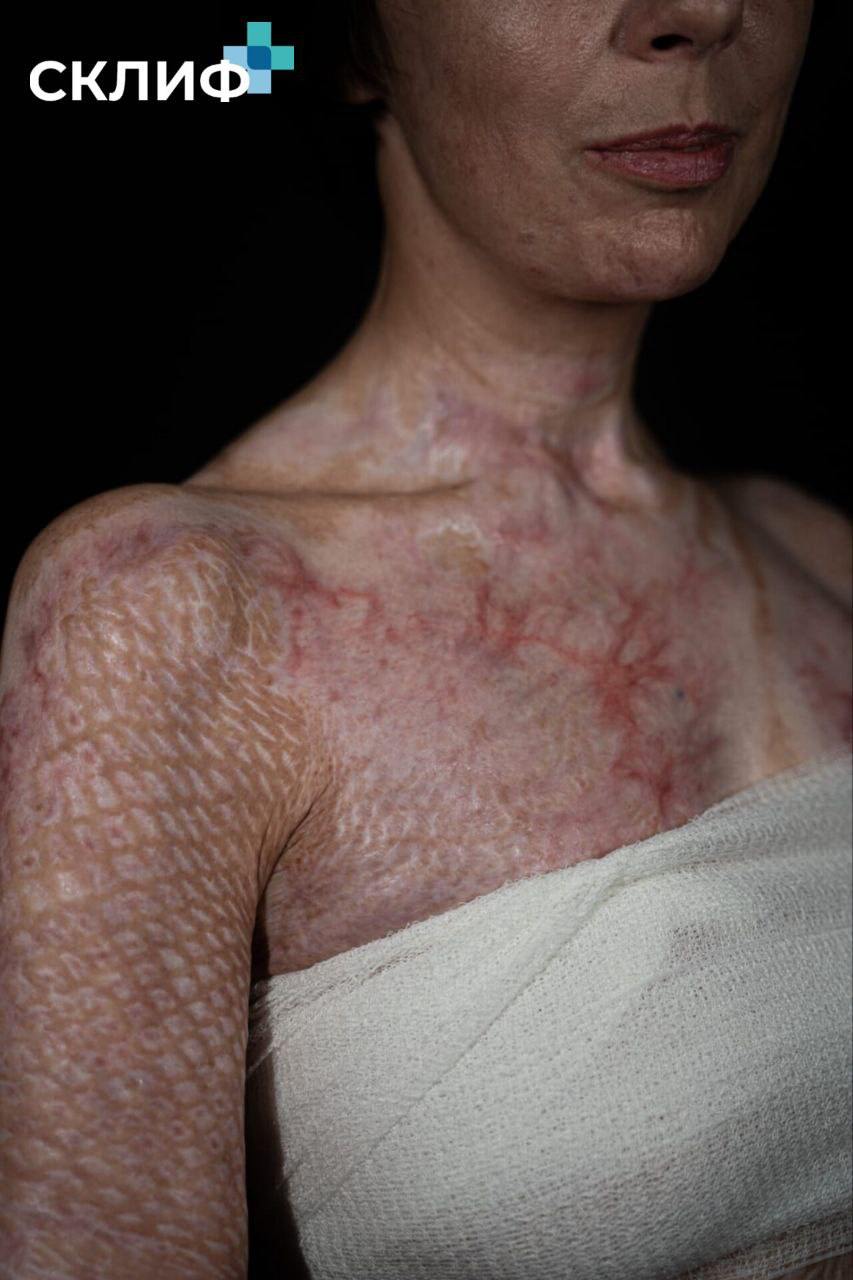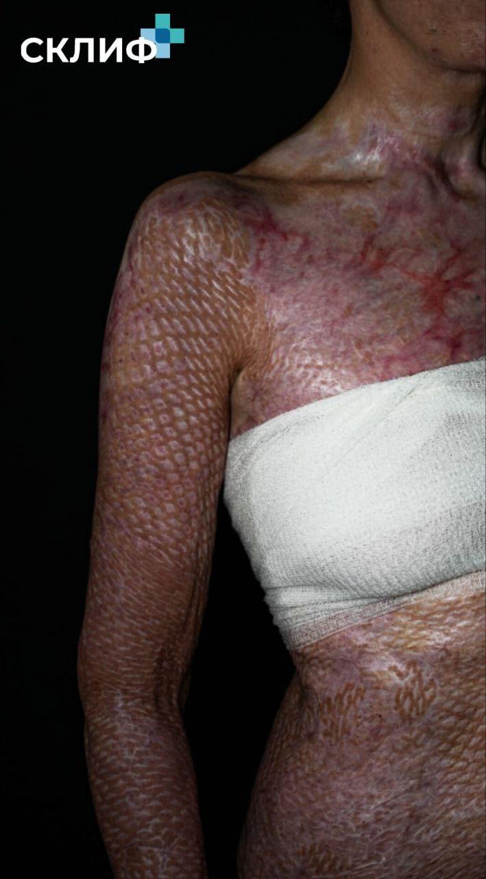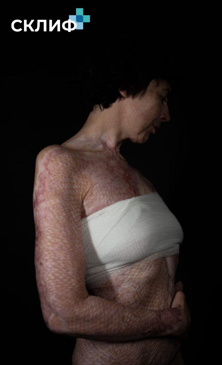 Женщину экстренно госпитализировали, диагностировали 60% ожогов тела. Из них 30% были глубокими (III стадии, что считается опасным для жизни). Сгорели руки, тело и шея. Всего врачи НИИ скорой помощи им. Склифосовского провели ей 10 операций — удалили некротизированные ткани и пересадили кожу.