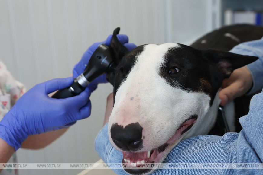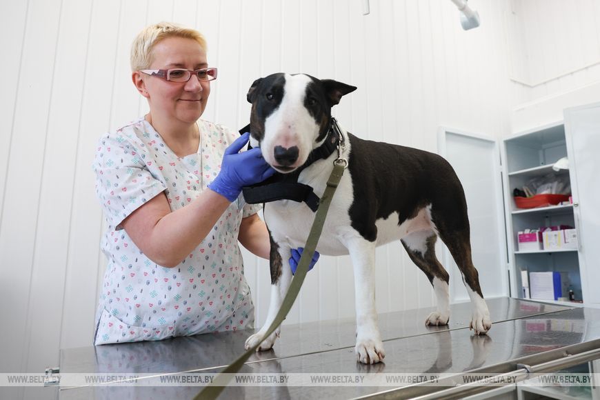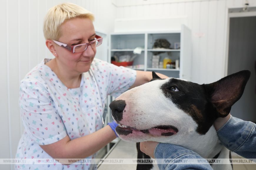 Во время общения с врачом в кабинете появился трехлетний бультерьер Умка. На вид грозная собака оказалась дружелюбной и готовой к осмотру. Это один из постоянных клиентов Ирины Зернятко. Пес легко отдается в ее руки и полностью доверяет, даже когда она держит шприц с иголкой.