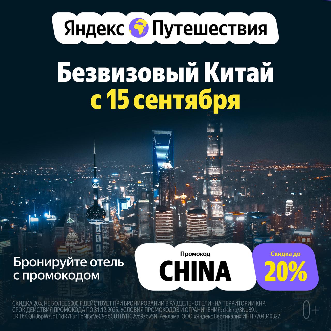 Используйте промокод CHINA, чтобы получить скидку на отели до 20% от Яндекс🌍Путешествий.