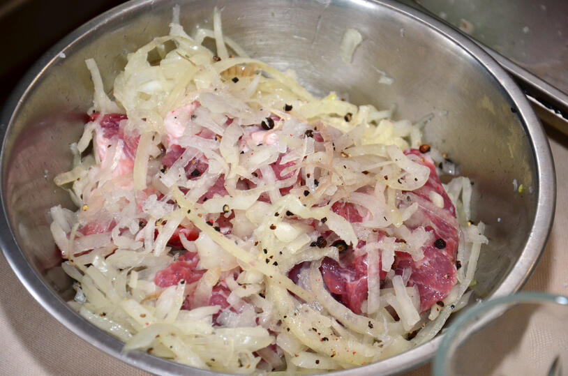 Что касается лука. Жирной шее подойдет репчатый лук, менее жирной корейке нужна сладость в виде красного лука. Не обязательно мариновать с луком говядину и курицу, потому что им не нужно расщепление.