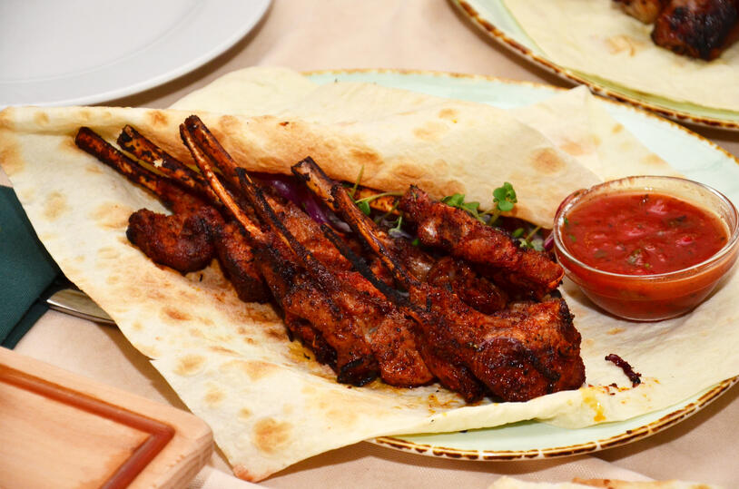 По словам Казабеева, в Крыму непросто обстоят дела с каре ягненка, потому что у нас мало барашков. Хороших, а главное маленьких, до 7 месяцев, удалось найти в Бахчисарае. В качестве маринада шеф-повар предлагает оливковое масло, соль, перец, чуть-чуть сухого чеснока, сладкую паприку, розмарин и немного сока лайма для аромата. Мясо укладываем на решетку, вместе с веточкой розмарина, тимьяна и тархуна. Подается с томатным соусом.