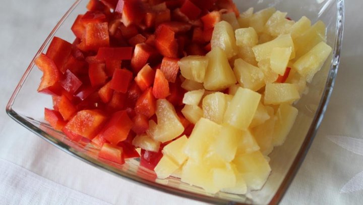 Консервированные ананасы нарезать маленькими кусочками. Сладкий перец нарезать небольшими квадратиками.