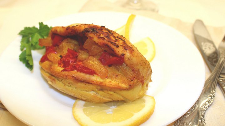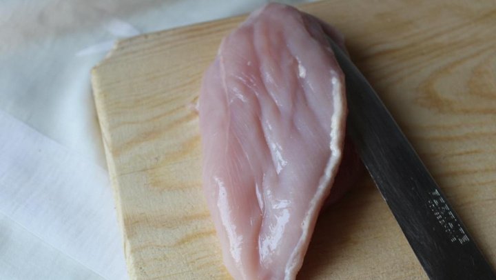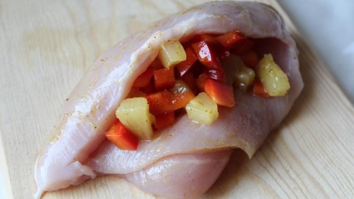 На куриных грудках с одной стороны сделать глубокие надрезы, чтобы получились кармашки. Снаружи куриные грудки слегка натереть солью и оставшимся порошком карри.