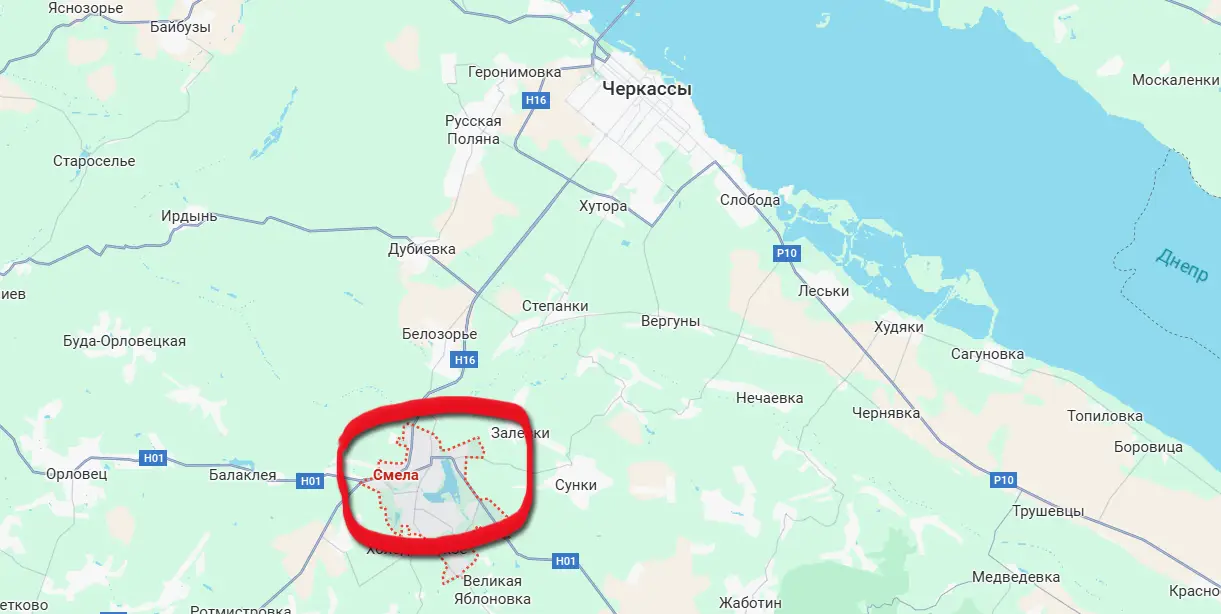 Появляется информация о прилётах в городе Смела, которая после удара ВС РФ «Геранями» по Крюковскому мосту в Кременчуге стала важным для ВСУ узлом логистики в плане переброски личного состава и перевозки грузов из правобережной части Украины в левобережную. От Смелы идут дороги как на Кременчуг, так и на Черкассы и Киев.