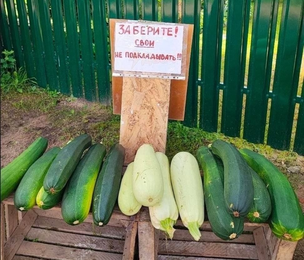 Костромские огородники, уставшие от бесконечных кабачковых оладий и рагу, организовали стихийные «овощные фримаркеты». Так, в одном из районов Костромы кто-то выставил у забора деревянные ящиички с кабачками, а рядом прикрепил записку как крик души: «Заберите. Свои не подкладывать!».