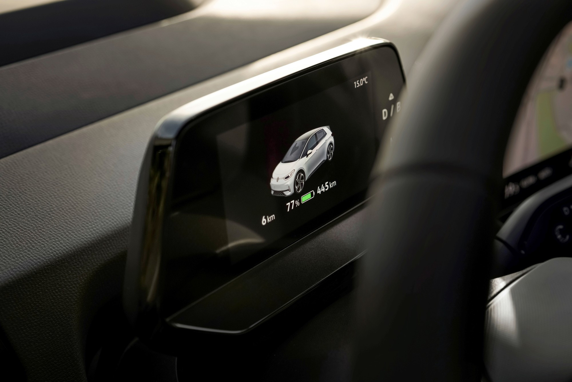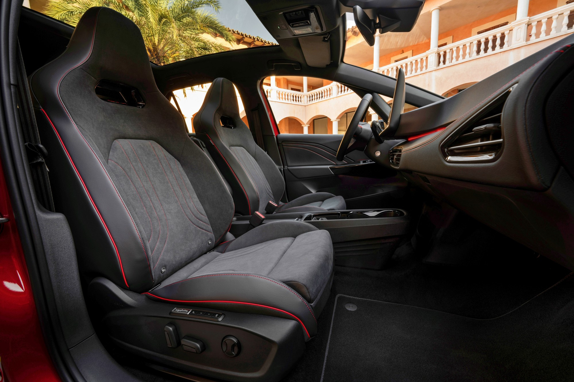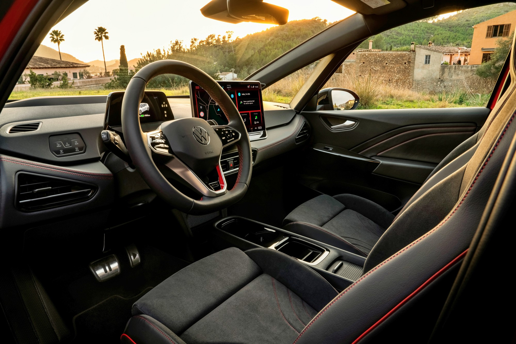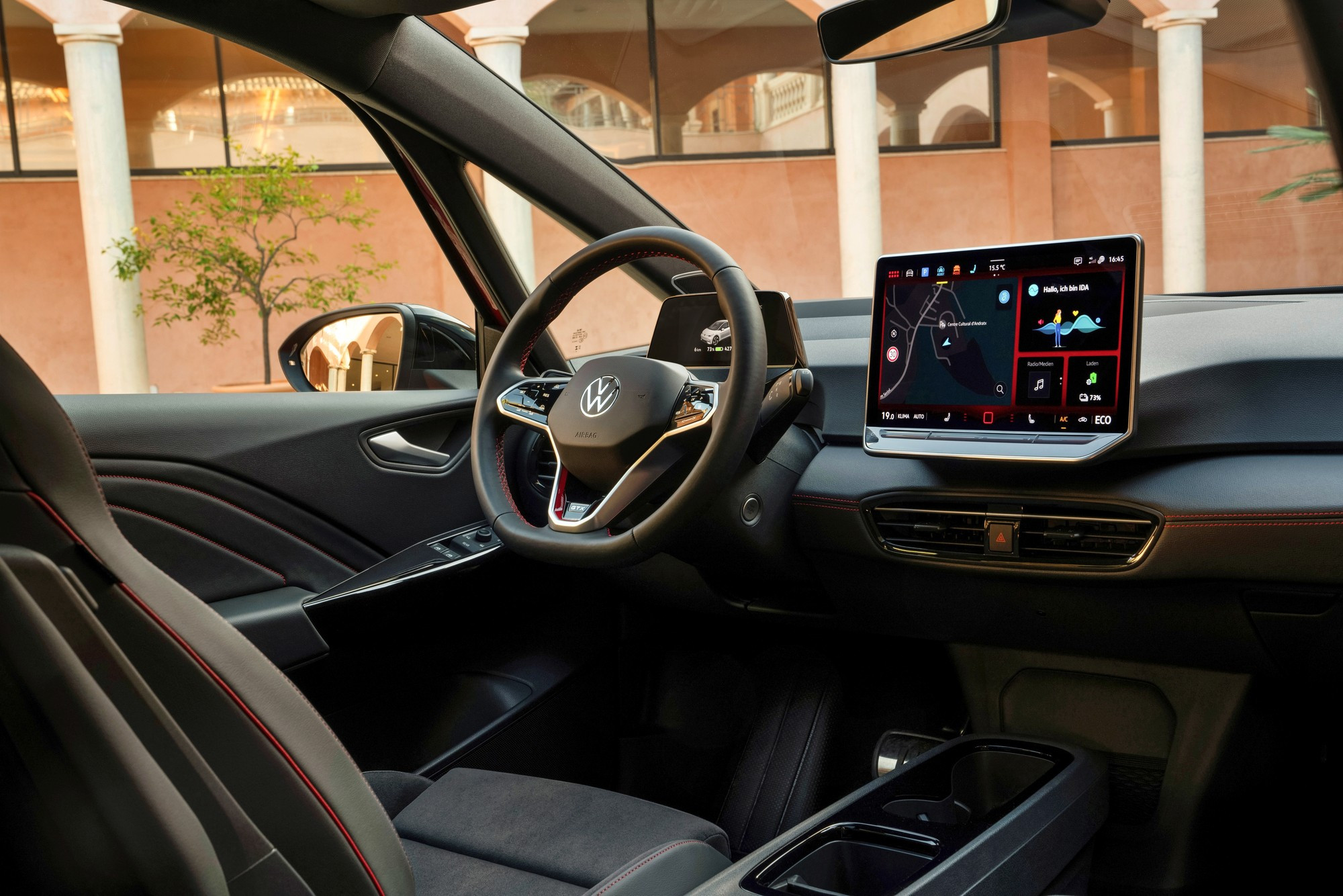 В салоне ID.3 GTX установлены передние спортивные кресла с развитой боковой поддержкой, электроприводом регулировок и комбинированной эко-обивкой с красной прострочкой. Красная прострочка есть также на руле, передней панели и дверных картах. ID.3 GTX, кроме того, первым в гамме получил более крупный 12,9-мультимедийный экран с новым голосовым помощником IDA и встроенным генеративными искусственным интеллектом ChatGPT.