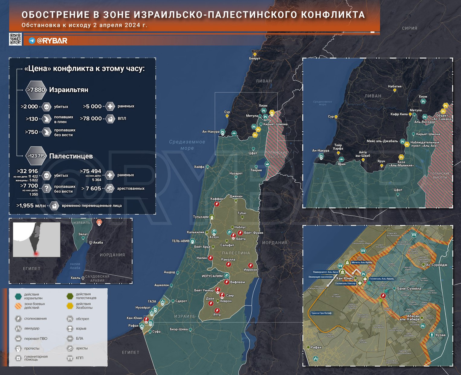 В центральной части анклава израильские войска нанесли удары по двум автомобилям к северу от Дейр аль-Балаха. Погибли шесть сотрудников гуманитарной организации World Central Kitchen. В АОИ пообещали провести тщательное расследование случившегося.