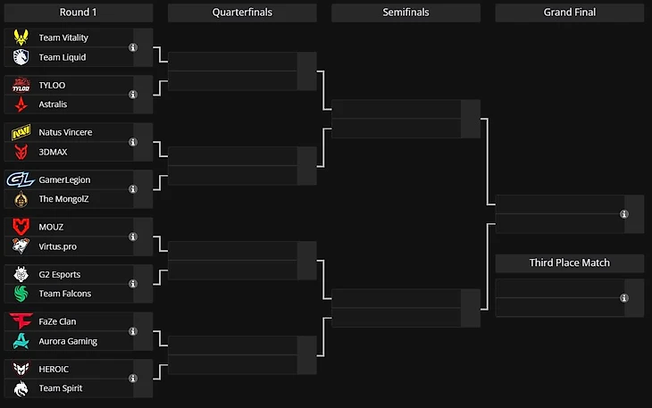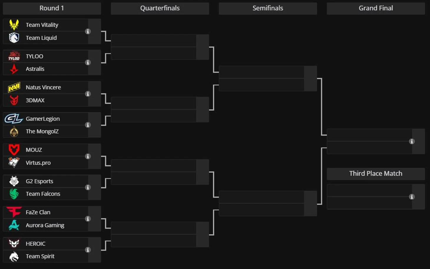 Участники: Vitality, Spirit, Mouz, Falcons, The Mongolz, G2, Aurora, NAVI, GamerLegion, Faze, Astalis, 3DMax, Heroic, Liquid, Virtus.pro, Tyloo.