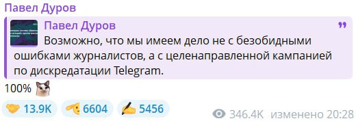 Павел Дуров на фоне сообщений об открытии офиса Telegram в РФ сделал отсылку к своей же публикации. «100%», — написал он, комментируя такую мысль: «Возможно, что мы имеем дело не с безобидными ошибками журналистов, а с целенаправленной кампанией по дискредитации Telegram». Ранее новость о намерении Telegram открыть офис в РФ опровергли источники редакции канала «Лобушкин». 🟩 Подписаться | Зеркало