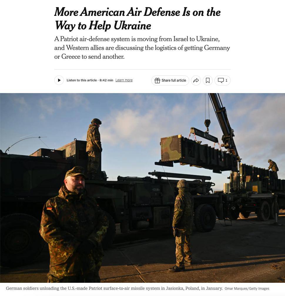 πΠ£ΠΊΡΠ°ΠΈΠ½Π° ΠΊ Π»Π΅ΡΡ ΠΏΠΎΠ»ΡΡΠΈΡ Π΅ΡΡ ΠΎΠ΄Π½Ρ ΡΠΈΡΡΠ΅ΠΌΡ Patriot, ΠΊΠΎΡΠΎΡΠ°Ρ ΡΠ΅ΠΉΡΠ°Ρ Π±Π°Π·ΠΈΡΡΠ΅ΡΡΡ Π² ΠΠ·ΡΠ°ΠΈΠ»Π΅. ΠΡΠΎΠΌΠ΅ ΡΠΎΠ³ΠΎ, ΠΎΠ±ΡΡΠΆΠ΄Π°Π΅ΡΡΡ ΠΏΠ΅ΡΠ΅Π΄Π°ΡΠ° ΠΠΈΠ΅Π²Ρ Π΅ΡΡ ΠΎΠ΄Π½ΠΎΠΉ ΠΈΠ· ΠΠ΅ΡΠΌΠ°Π½ΠΈΠΈ ΠΈΠ»ΠΈ ΠΡΠ΅ΡΠΈΠΈ β The New York Times.