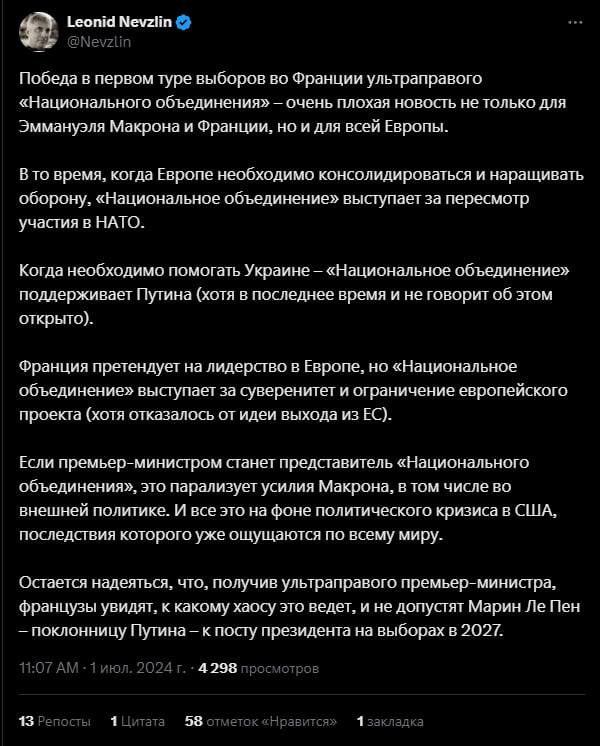 Ленечка Невзлин, вор и убийца, сидя в охренеть каком демократическом Израиле, опечален результатами демократических выборов во Франции. Видимо, и там народ не тот.