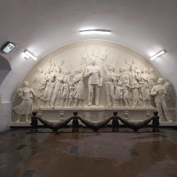 На станции "Таганская" Кольцевой линии московского метро открыли барельеф с изображением Иосифа Сталина. Это уменьшенная копия скульптуры "Благодарность народа вождю-полководцу", которая была демонтирована и уничтожена в 60-х годах прошлого века. Отмечается, что открытие барельефа приурочили к 90-летию столичного метрополитена, которое отмечается сегодня, 15 мая - в день запуска первой линии. Барельеф работы скульпторов Евгении Блиновой и Павла Баландина посвящён победе в Великой Отечественной войне. В композиции изображён Сталин в окружении трудящихся и детей на Красной площади. Композиция находилась в торце станции, где расположен переход на одноимённую станцию. Однако в 1965 году барельеф в рамках с десталинизации заменили на панно с Лениным, а ужу в 1966 году убрали и Владимира Ильича из-за строительства перехода на радиальную линию. Исследователь советского монументального искусства и архитектуры Александр Зиновьев рассказал, что композиция в целом повторяет оригинал, но для неё использовали другой материал, не повторили цвет, а также "не постарались сделать детали орнамента по периметру"."В целом, получился идеологический жест, где главным стало не восстановление исторического архитектурного облика", - поделился мнением архитектор.