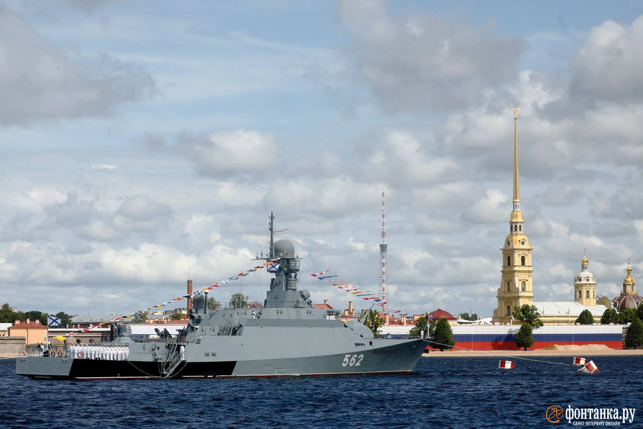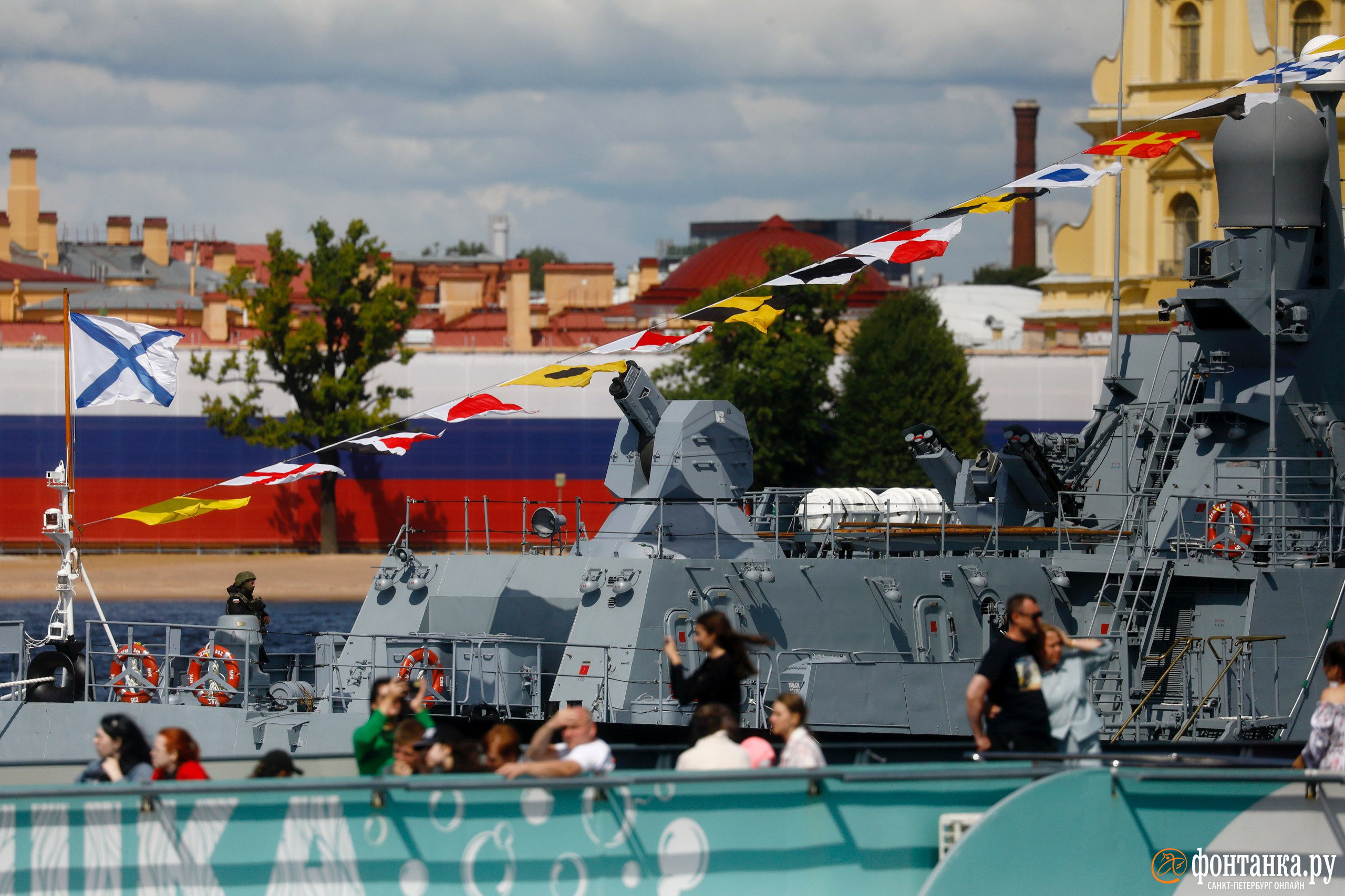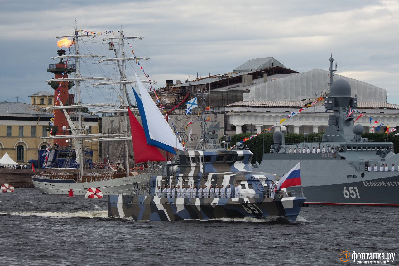 Петербуржцы и гости города последние две недели могут наблюдать военные корабли на Неве. Это участники парадного строя, который Владимир Путин будет обходить на президентском «Буревестнике». Главу государства будут приветствовать экипажи малых ракетных кораблей (мрк) «Буря» и «Зеленый дол». Первый сейчас находится на госиспытаниях, после которых его передадут Балтийскому флоту, а второй — черноморец — до этого дважды участвовал в петербургских парадах, в динамической части. Малые ракетные пришвартованы за Дворцовым мостом, ближе к Петропавловской крепости. Возглавляет парадный строй уже привычный к парадам ВМФ парусный линейный корабль «Полтава». Между Дворцовым и Благовещенским мостами стоят две подводные лодки («великомученица» Северного флота «Санкт-Петербург» и ее сестра по проекту 667 «Великие Луки»), а по центру — прямо напротив Сенатской площади — сторожевой корабль Балтийского флота «Неустрашимый».