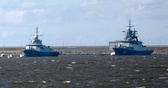 Для прохождения в кильватерном строю в Финском заливе в Кронштадт прибыли десять кораблей ВМФ и один от ФСБ. Балтийский флот представлен малыми противолодочными кораблями «Уренгой» (6-й парад) и «Зеленодольск» (5-й парад), ракетными «Одинцово» (3-й парад) и «Град», корветами «Стойкий» и «Сообразительный», учебным «Смольный». Здесь интересен мрк «Град». Он был передан флоту в конце прошлого года. Это «младший брат» «Углича» и «Зеленого дола» из достраиваемого проекта 21631 «Буян-М». Среди вооружения — крылатые ракеты «Калибр» и «Оникс».