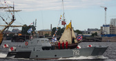 В прохождении по Неве будут от ВМФ задействованы 8 катеров и 3 корабля (год назад было 17 единиц). От Балтийского флота и Каспийской флотилии пойдут уже знакомые противодиверсионные катера проекта «Грачонок» («Нахимовец», «П-468», «П-474», «Юнармеец Дагестана»), десантные катера («Алексей Баринов» с ботиком Петра I борту и «Иван Пасько»), патрульные — «Раптор» («Евгений Колесников» и «П-436»). Балтфлот покажет также уже привычные зрителям базовый тральщик БФ «Павел Хенов» и малый ракетный корабль «Советск». С Каспия прибыл мрк «Углич». Это практический такой же «Зеленый дол», только на пару лет постарше. Пограничный сторожевой катер ФСБ — «Соболь» и два катера петербургского МЧС завершат прохождение парадного строя.