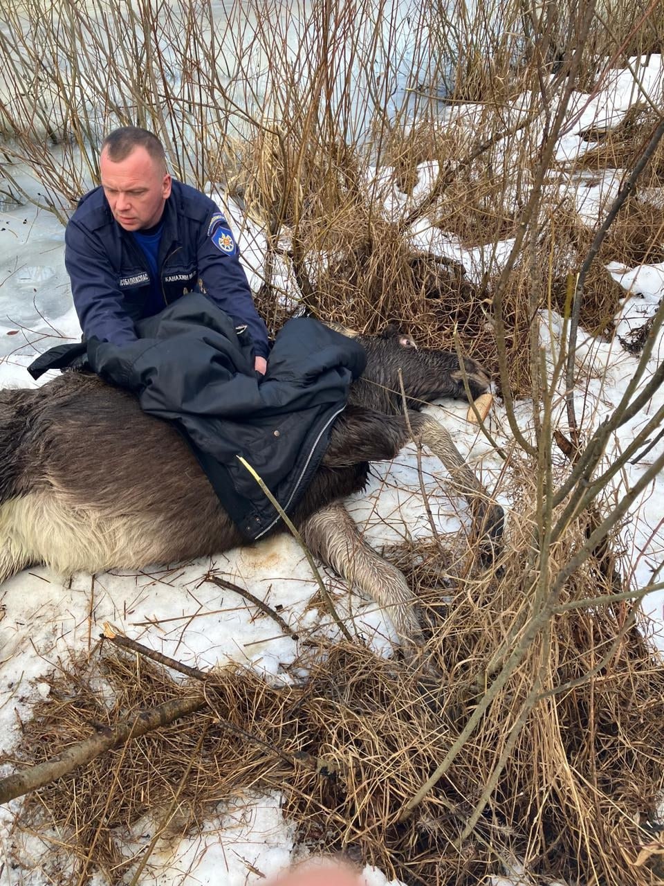 «Участники спасательной операции укрыли будущую мамочку термоодеялом и массировали замёрзшее животное, чтобы восстановить кровообращение, а когда убедились, что лосиха пришла в себя и может самостоятельно передвигаться, отпустили в её естественную среду обитания», – рассказали в Мособлпожспасе.