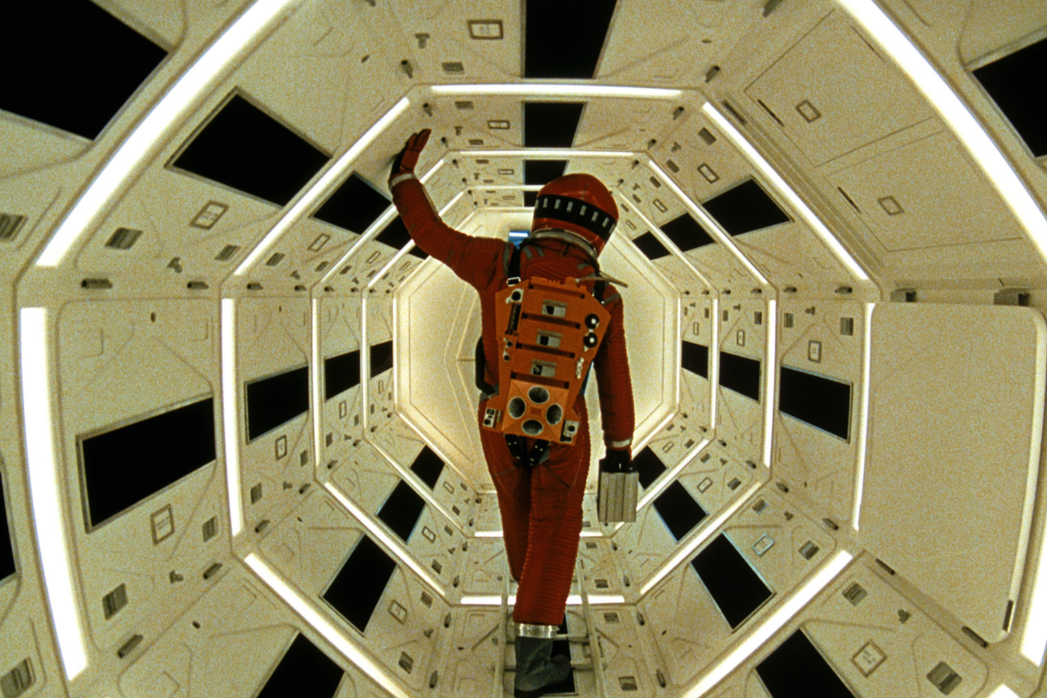 Медитативное повествование дополняет идеально выстроенный визуальный ряд. Кубрик создавал прорывные для того времени визуальные эффекты. Например, чтобы герои могли ходить по стенам, сделали специальные вращающиеся декорации. В дополнение — традиционная для режиссера идеальная симметрия в кадрах.
