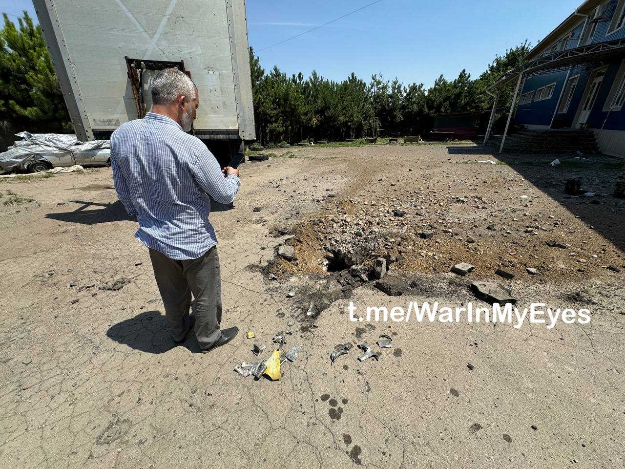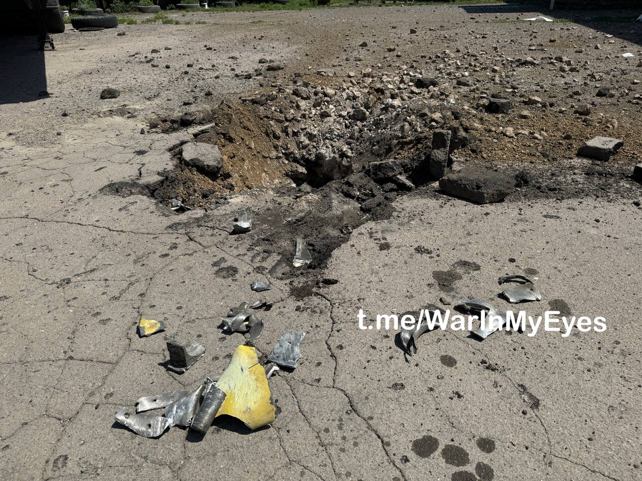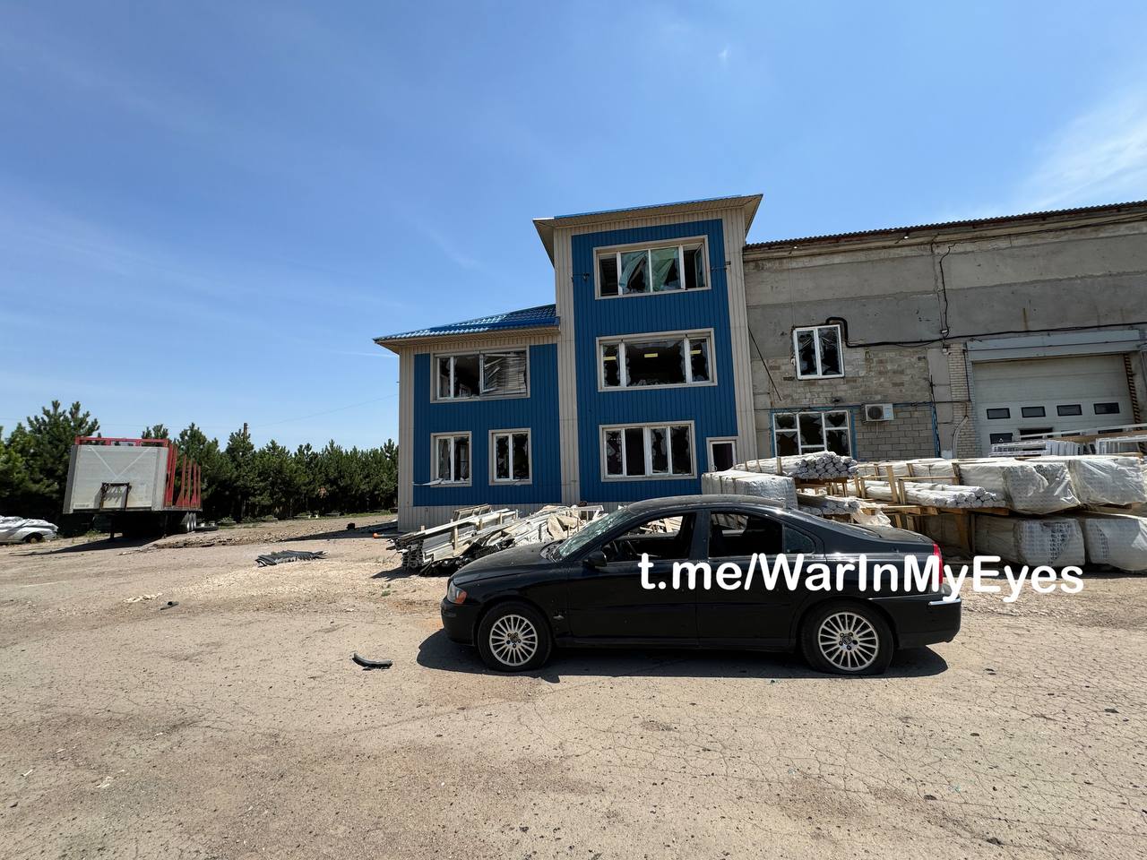 Последствия обстрела города Волноваха из РСЗО «HIMARS», попадание на территорию строй предприятия, предварительно 2 человек погибли, 4 ранено.