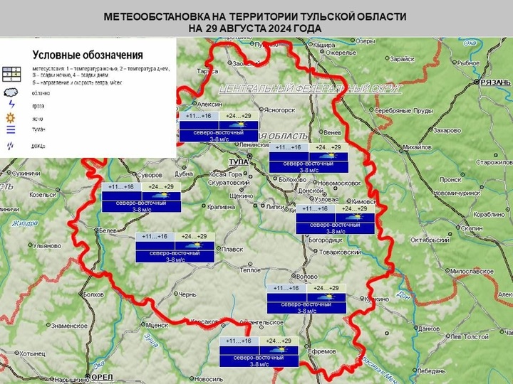 "Переменная облачность, без осадков. Ветер северо-восточный 3-8 метров в секунду. Температура воздуха ночью +11…+16°С, днем +24…+29°С. Атмосферное давление 750-755 мм ртутного столба. Метеорологическая дальность видимости - 7000 метров", - говорится в официальном сообщении ЦУКС ГУ МЧС России по Тульской области.
