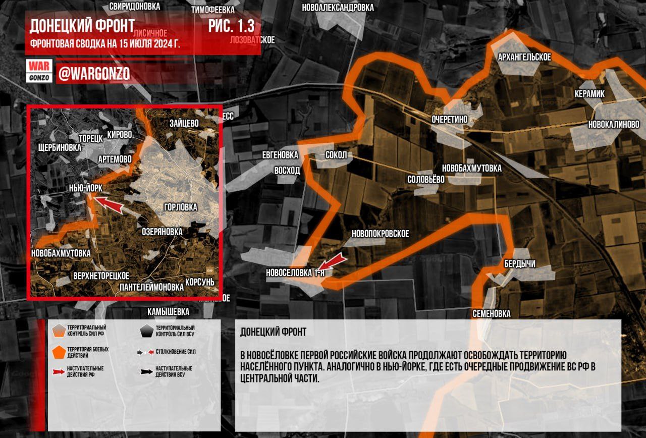Донецкий фронт. ВС РФ продолжают двигаться в Урожайном, есть очередные тактические успехи. Продолжаются бои на окраинах Константиновки. В Красногоровке ВС РФ развивают наступление, продолжая выбивать украинский гарнизон на окраины города. В районе Карловки без особых изменений, продолжаются штурмовые действия ВС РФ. В Новосёловке Первой российские войска продолжают освобождать территорию населённого пункта. Аналогично в Нью-Йорке, где есть очередные продвижение ВС РФ в центральной части. (Рис. 1)