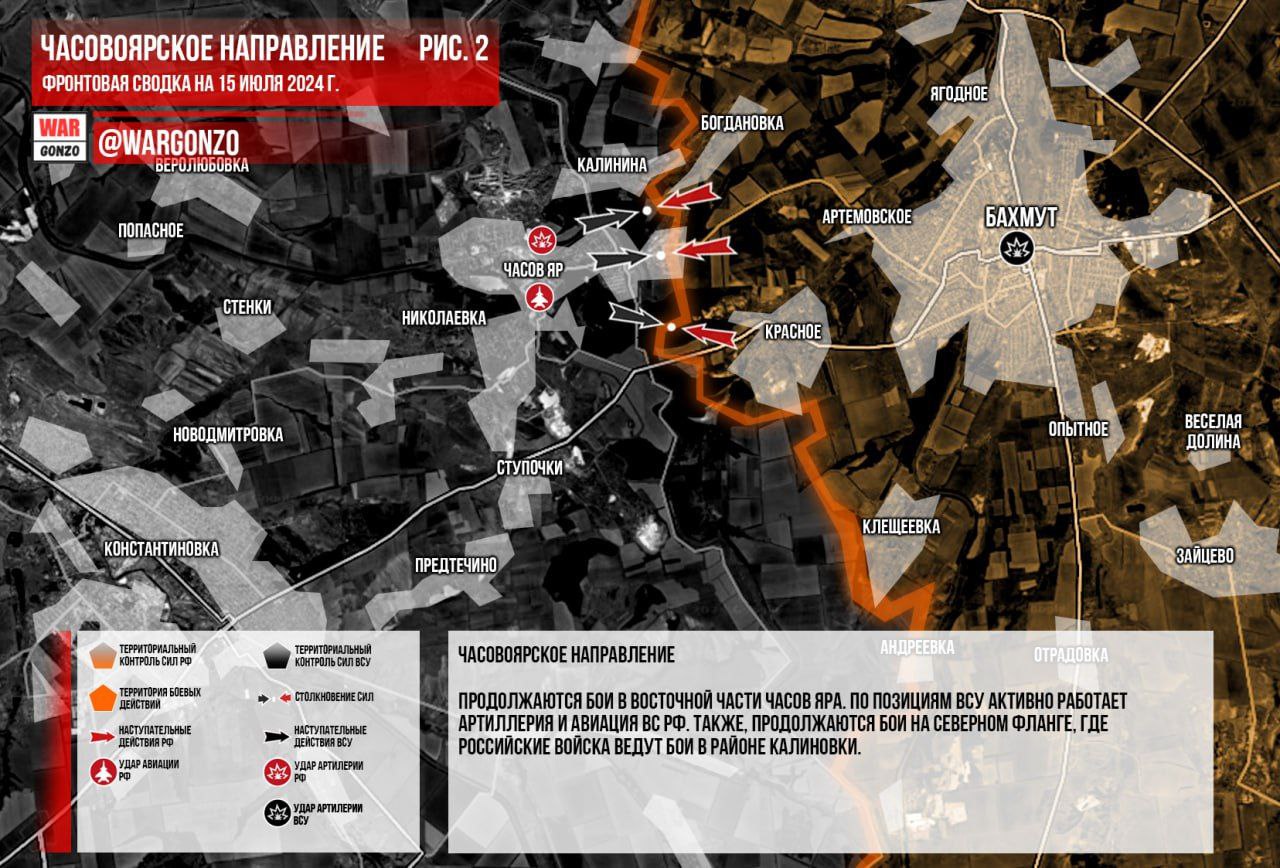 Часовоярское направление. Продолжаются бои в восточной части Часов Яра. По позициям ВСУ активно работает артиллерия и авиация ВС РФ. Также, продолжаются бои на северном фланге, где российские войска ведут бои в районе Калиновки. (Рис. 2)