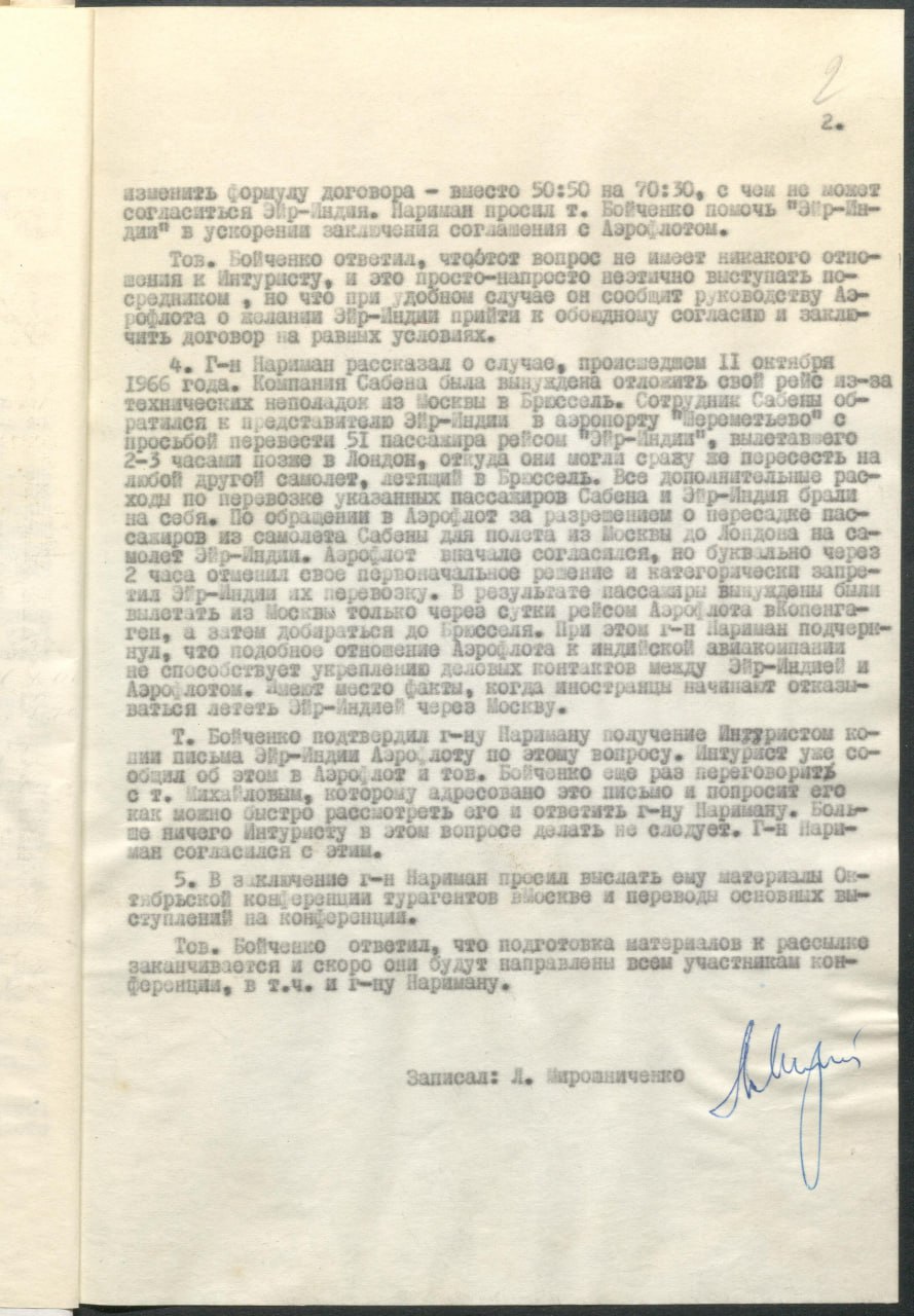 Во время беседы, состоявшейся в ягваре 1967 г., представитель государственной индийской авиакомпании господин Нариман поднял вопрос об особенностях обращения с транзитными пассажирами в аэропорту «Шереметьево». Борты Air India в те годы осуществляли посадку в Москве на пути из Дели в Лондон. Пассажиров на время обслуживания борта выпускали в аэропорт. Однако, советские власти при оформлении выхода отбирали у пассажиров паспорта и выдавали транзитные карточки. На посадки карточки надо было вновь обменивать на паспорта, «которые без всякой системы сложены в ящик».