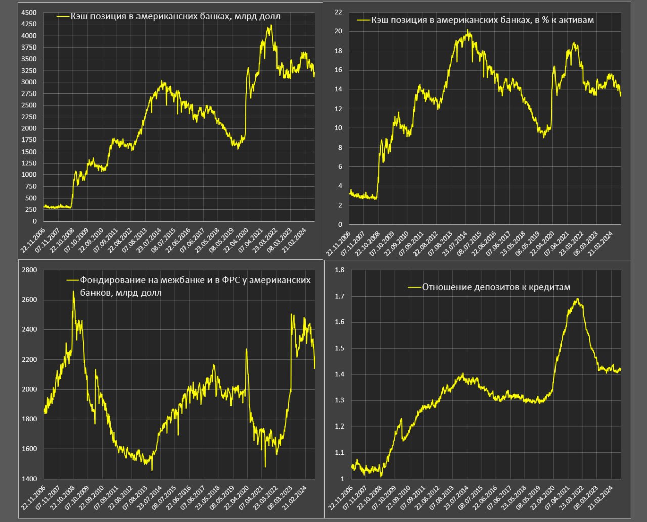 ▪️Фондирование американских банков на межбанке и ФРС составляет 2.2 трлн, что ниже пиковых 2.5 трлн в период банкопада в мар.23, но выше периода избытка ликвидности 2020-2021, когда среднее фондирование составляло 1.6-1.7 трлн.