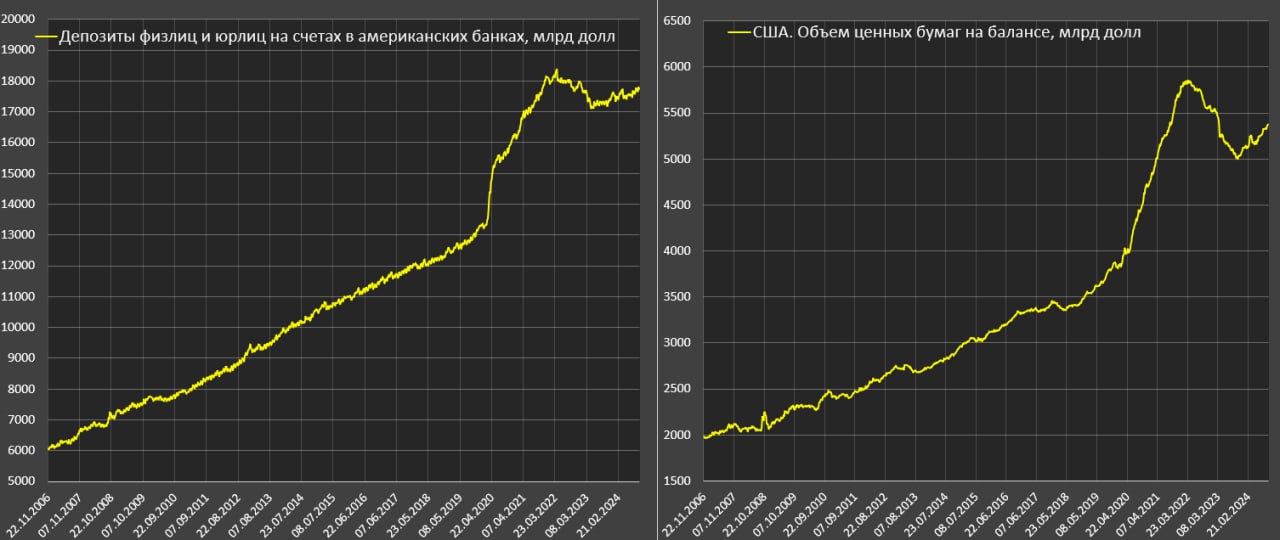 ▪️Объем депозитов физлиц и юрлиц в пассивах американских банков оценивается в 17.73 трлн на 9 октября 2024. Минимум по депозитам был установлен в начале мая 2023 – 17.1 трлн, а максимум – 18.37 трлн весной 2022.