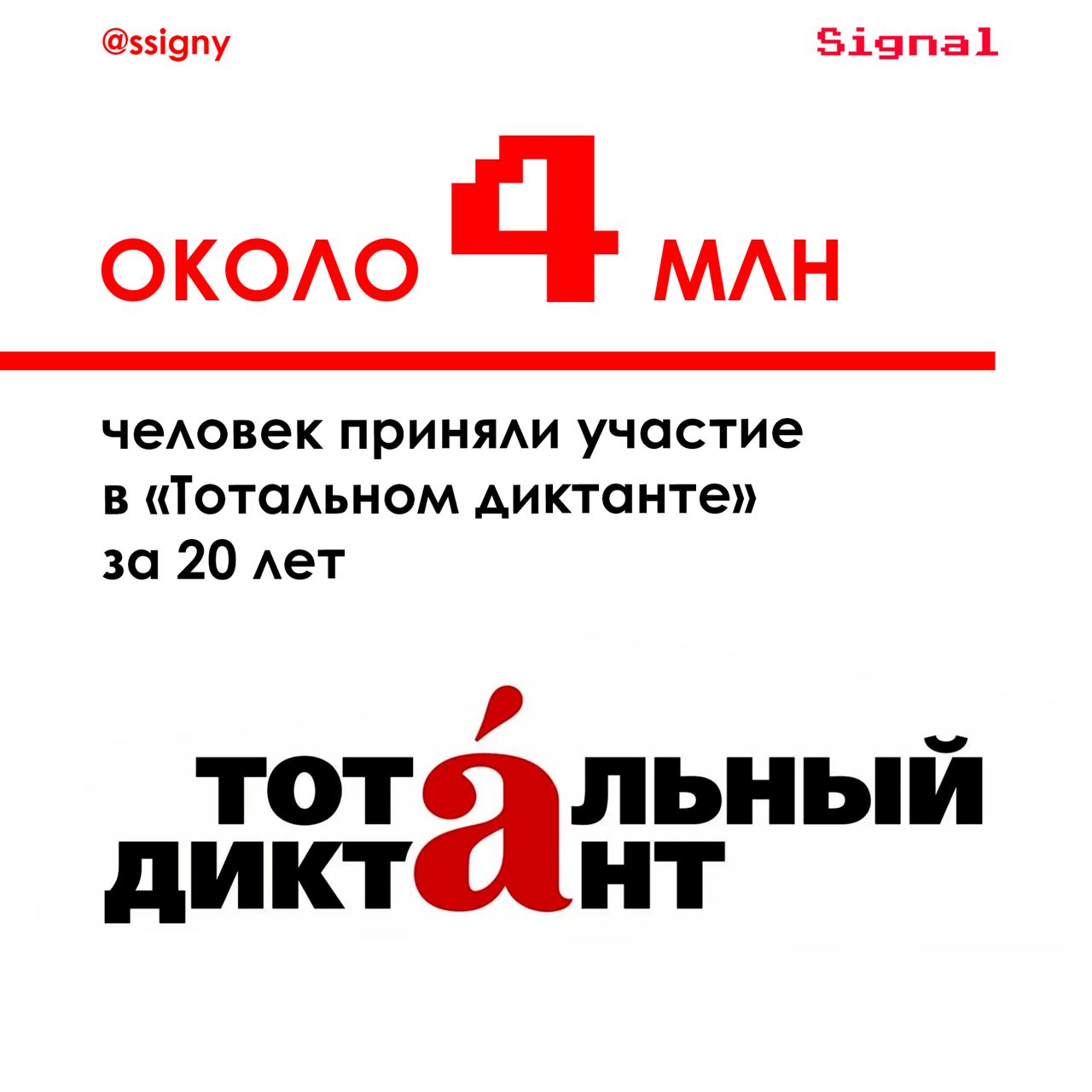 Порядка 4 млн человек приняли участие в "Тотальном диктанте" за 20 лет проведения акции, сообщил руководитель фонда "Тотальный диктант" Вячеслав Беляков. Беляков отметил, что проекты "Тотального диктанта" реализуются в течение всего года. В рамках одного из них переводятся тексты диктанта на национальные языки малых народов России, иностранные языки.