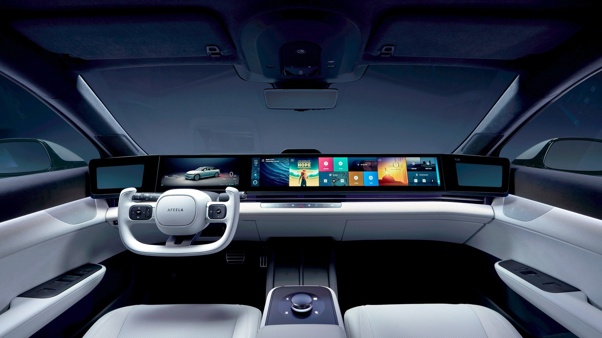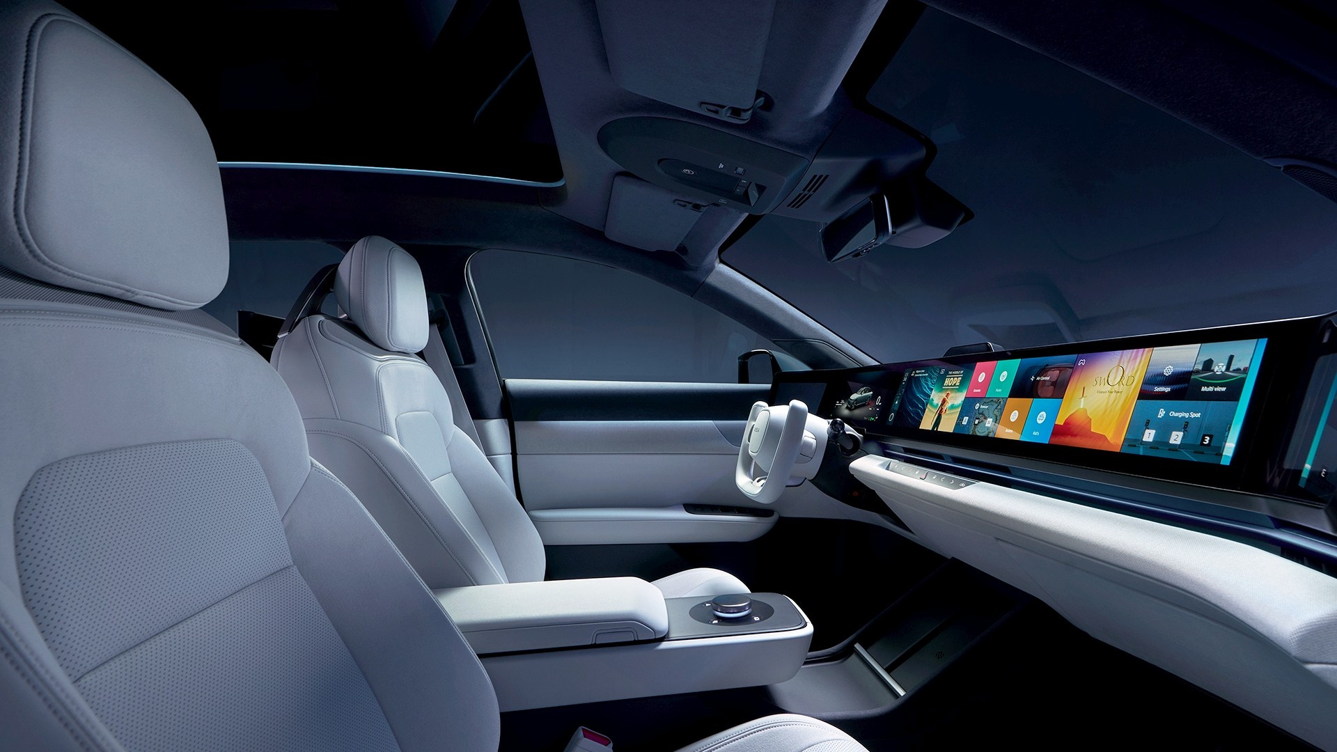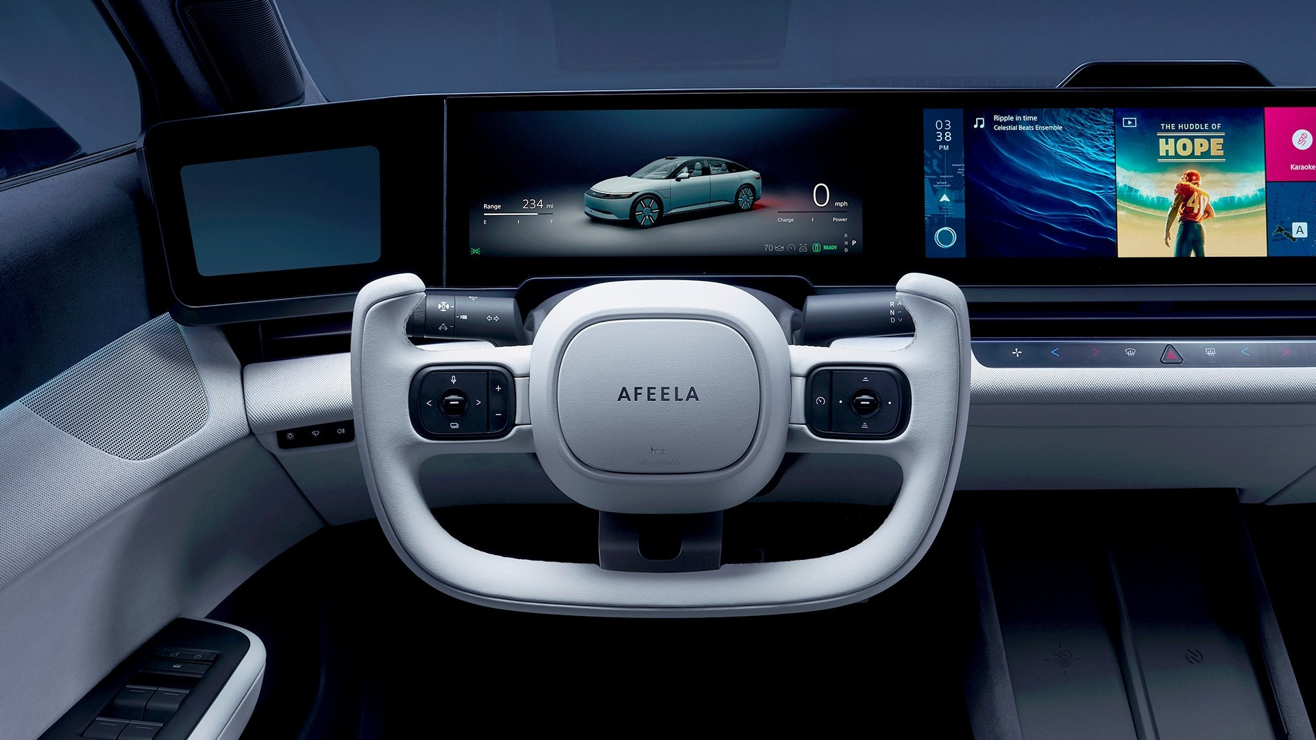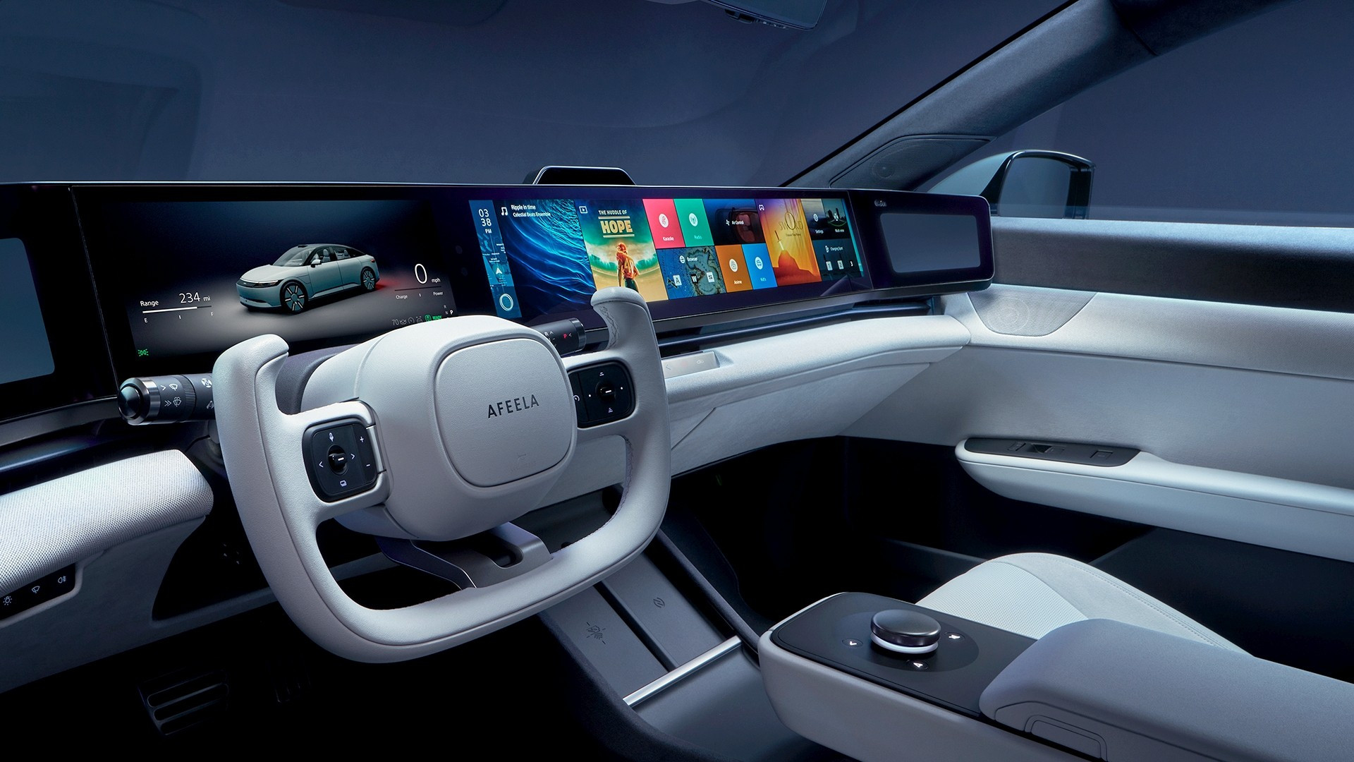 Между тем главная ценность Afeela — не «железо», а широчайшие мультимедийные возможности. По сути, Afeela — это большая мобильная многоэкранная игровая приставка, причём в будущем она сможет ездить по дорогам в полностью беспилотным режиме, и тогда водитель вместе с пассажирами сможет в головой погрузиться в развлечения. Наружные камеры заднего вида на передних дверях у свежего прототипа заменены традиционными зеркалами, но при этом у гигантского табло на передней панели салона сохранились боковые секции для трансляции картинок с камер. Мелкие детали интерьера более тщательно проработаны по сравнению с прошлогодним прототипом, но в целом дизайн прежний.