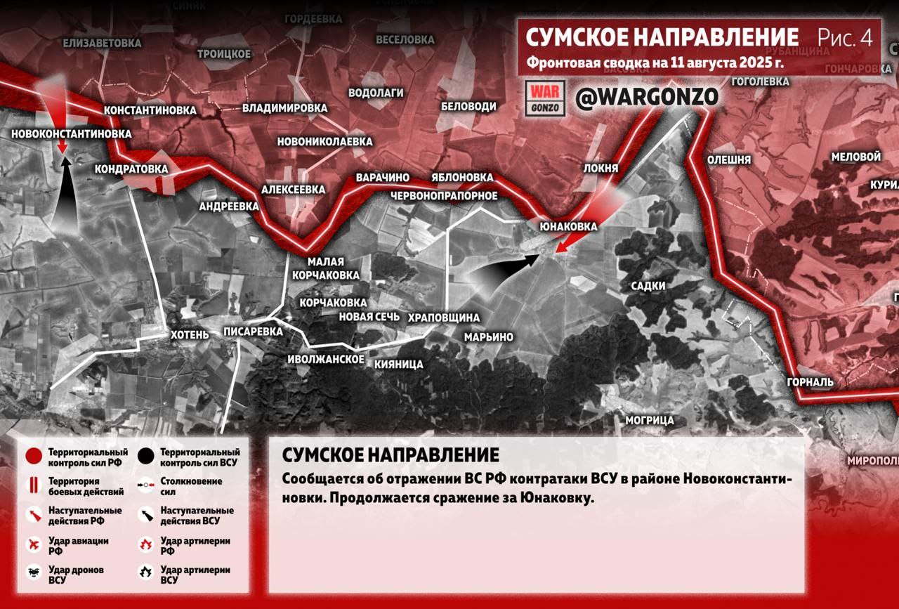 Сумское направление. Сообщается об отражении ВС РФ контратаки ВСУ в районе Новоконстантиновки. Продолжается сражение за Юнаковку. (Рис.4)