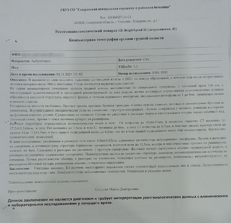 - И тут началось! На следующий день меня отправили срочно на КТ! И что оно нам показало? Множественные метастазы в легкие, кости, позвоночник, - рассказала сызранка.