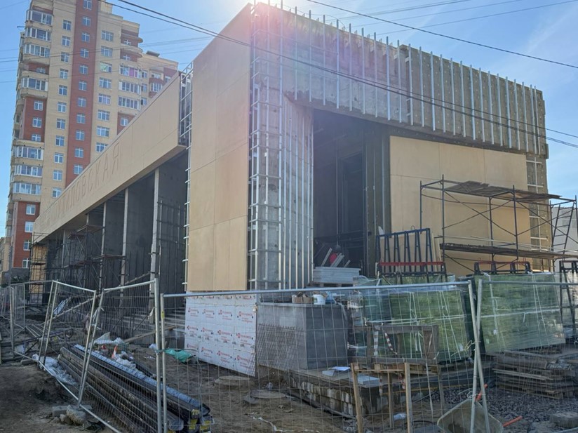Сейчас специалисты устанавливают направляющие для стеклянного фасада на уровне первого этажа со стороны проезда между вестибюлем и ДК имени Газа. Вместе с тем ведётся монтаж металлоконструкций козырька служебной части вестибюля.