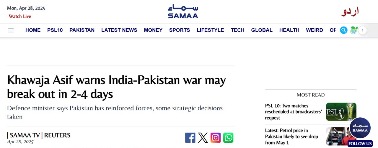 Кроме того, в эфире телешоу канала «Красная линия с Талатом» Асиф заявил: «Над регионом сгущаются тучи войны, напряженность в отношениях между Пакистаном и Индией достигла угрожающего уровня. Война между двумя странами может разразиться в течение ближайших двух-четырех дней».