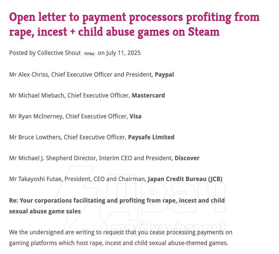 Они обратились напрямую к руководству крупных платёжных компаний — PayPal, Mastercard и Visa — с просьбой повлиять на политику магазина Valve.