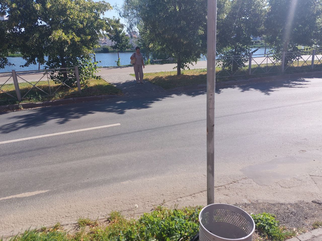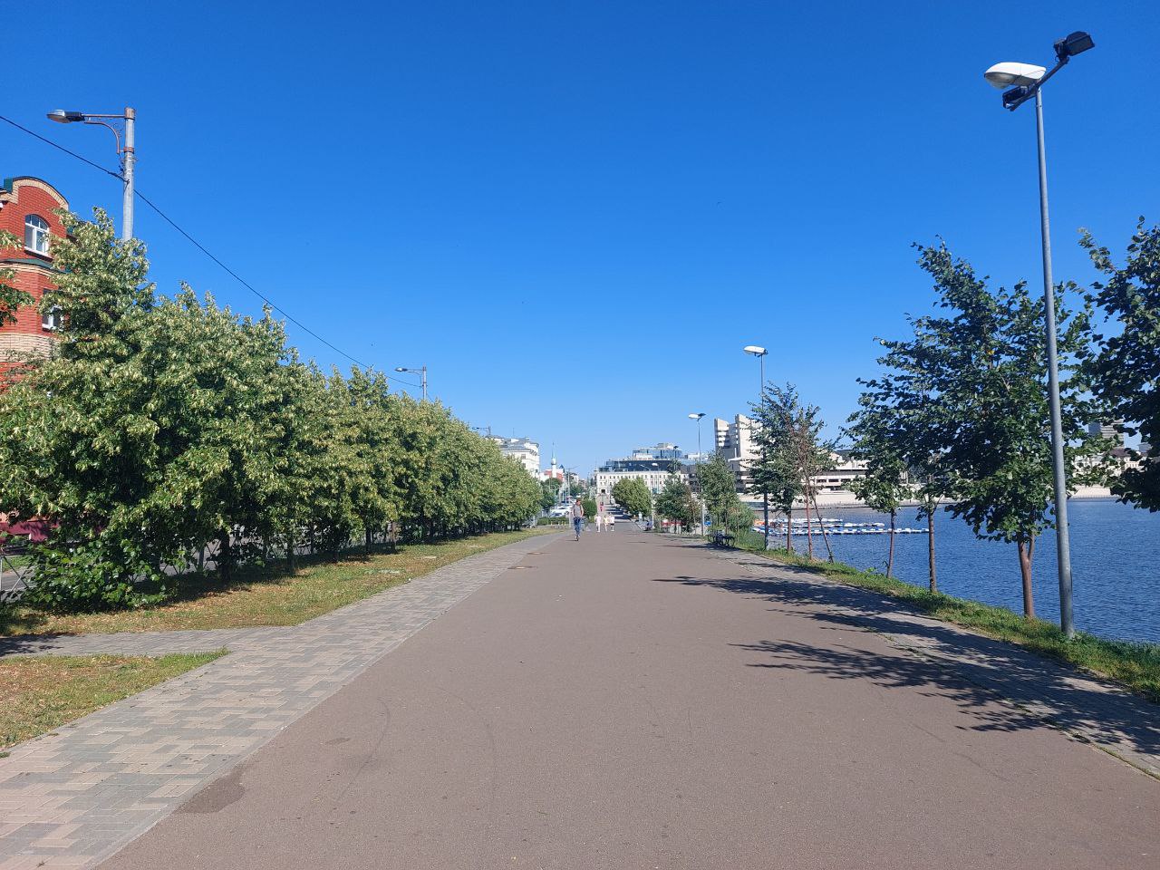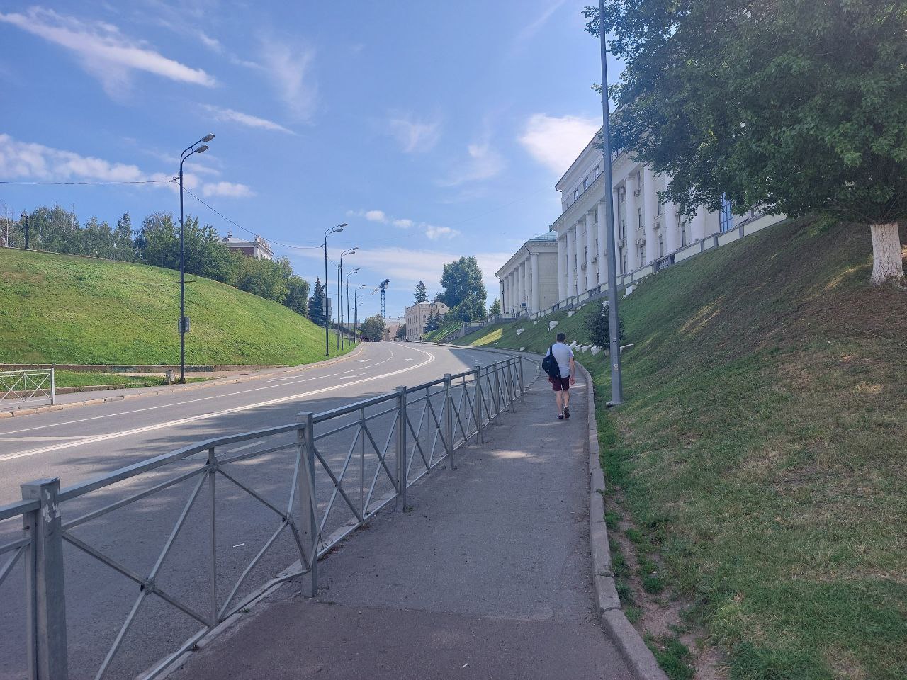 Пропустив все машины, движемся по первому переходу – высокий бордюр нам не преодолеть. Выходим к озеру Кабан. Вдоль него можно дойти до старого здания театра Камала и нового. Обе дороги хрестоматийно со своими приключениями. Сперва пойдем к старому зданию театра Камала. Тут более удобная и обустроенная дорога, но с постоянным спуском. Вспомните то, о чем мы говорили в начале. Спускаться тяжелее, чем подниматься. Человеку, везущему коляску, нужно каждую секунду удерживать аппарат от стремительного ската. Мы попробовали это сделать и ощутили, как с непривычки горят мышцы на ногах и предплечьях.